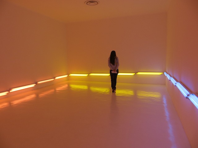 La visita inizia con le opere degli artisti del movimento “Light and Space” di Los Angeles. L’installazione Varese Room (1976) di Maria Nordman, immergendoci nell’oscurità, ci fa comprendere il rapporto luce/buio e spazio. Da una porta si entra in uno spazio, la luce sparisce e inizia la penombra. Una seconda porta fa accedere a una stanza completamente buia, l’unica luce naturale che filtra dall’esterno è data da due sottilissime fessure. Il nostro occhio ha una capacità molto forte di adattarsi alla scarsità di luce, ma non immediatamente. Quando passiamo dalla luce al buio, inizialmente non vediamo nulla, ma se stiamo fermi nella stanza per qualche minuto la sottilissima luce che filtra dalle fessure ci aiuta a percepire il perimetro della stanza. L’assenza di luce è qualcosa a cui non siamo abituati. Quando siamo al buio la sensazione di spaesamento è massima, ma focalizzando la nostra attenzione sui pochi punti di riferimento dell’ambiente riusciamo ad acquisire sicurezza in noi stessi, fino a trovare la via d’uscita.