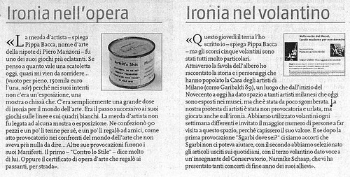 Su Nòva 24 di giovedì 4 ottobre Pippa Bacca racconta come può esserci ironia in un’opera (Merda d’artista di Piero Manzoni) e in un volantino.